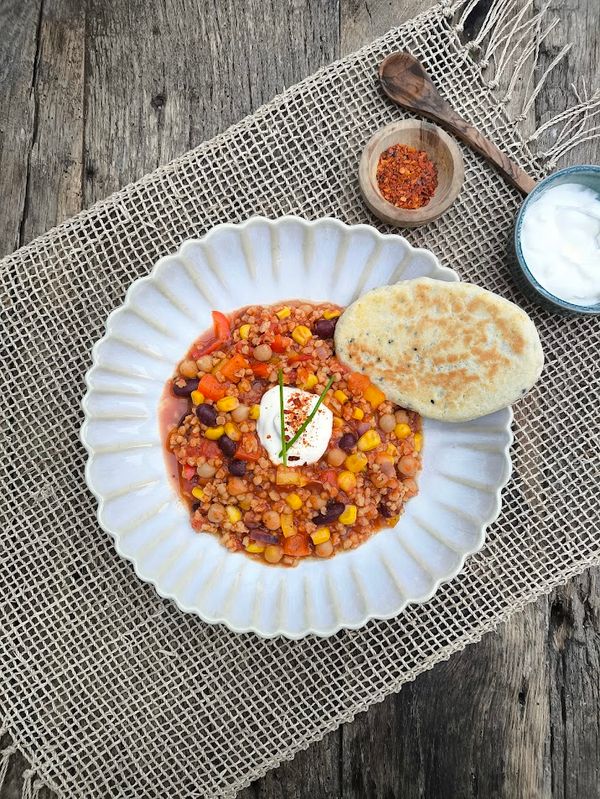 Für 20 Minuten köcheln lassen. Mit einem Klecks Crème fraîche und einem Naanbrot servieren.